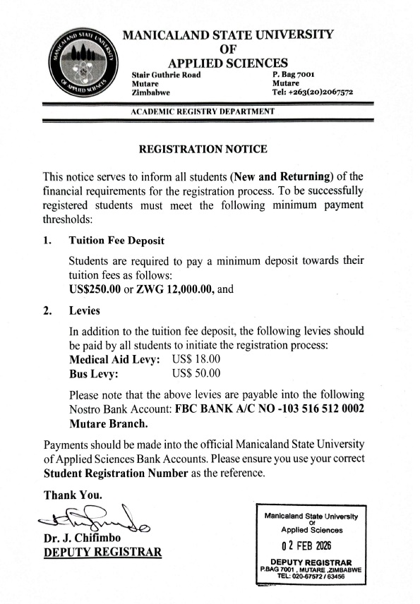 March 2026 Registration Notice Post author: Post published:February 2, 2026 Post category:NEWS March 2026 Registration Notice Manicaland State University Of Applied Sciences website You Might Also Like MSUAS VICE CHANCELLOR’S SPORTS GALA A SUCCESS April 24, 2024 2025 Graduation gallery October 23, 2025 MSUAS, MUTARE CITY COUNCIL SIGN HISTORIC MOA April 24, 2025